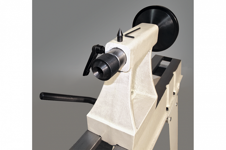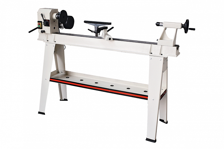 Размеры между центрами и над станиной достаточно велики, чтобы обрабатывать крупные заготовки. Таким задачам соответствует мощный асинхронный 750-ваттный двигатель, имеющий рёбра охлаждения и рассчитанный на продолжительную работу. Для передачи вращения использован клиноременный вариатор, имеющий 10 фиксированных скоростей для удобства переключения. Меняют их, не выключая мотор.